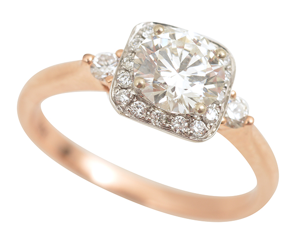 The round brilliant cut diamond of 1.01cts surrounded by further diamonds, set in 18ct white and rose gold, ring size O.
