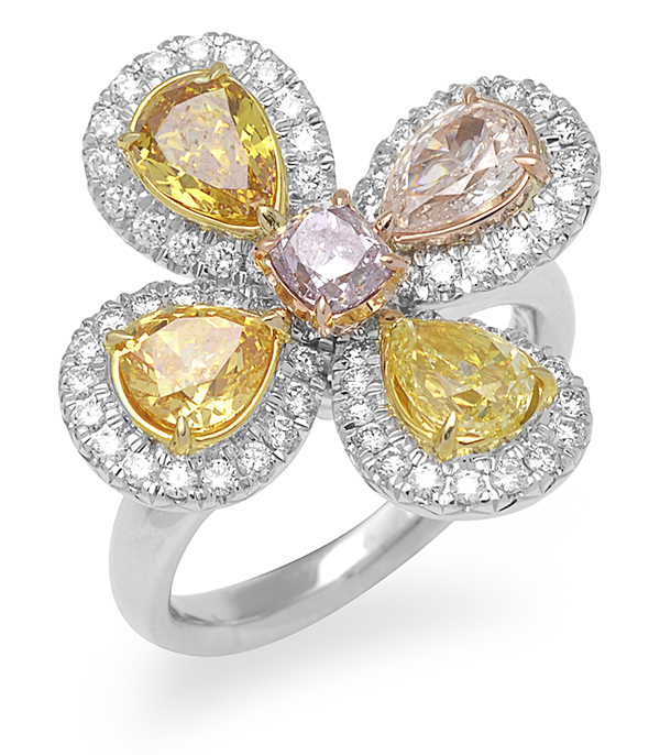 Modelled as a flower, centrally set with a modified brilliant cushion cut fancy purple pink diamond weighing 0.37cts, the four pear modified brilliant cut petals all fancy natural colour totalling 2.42cts, surrounded by white diamonds, accompanied by GIA certification for each of the principal diamonds, mounted in platinum and 18ct gold, ring size M.