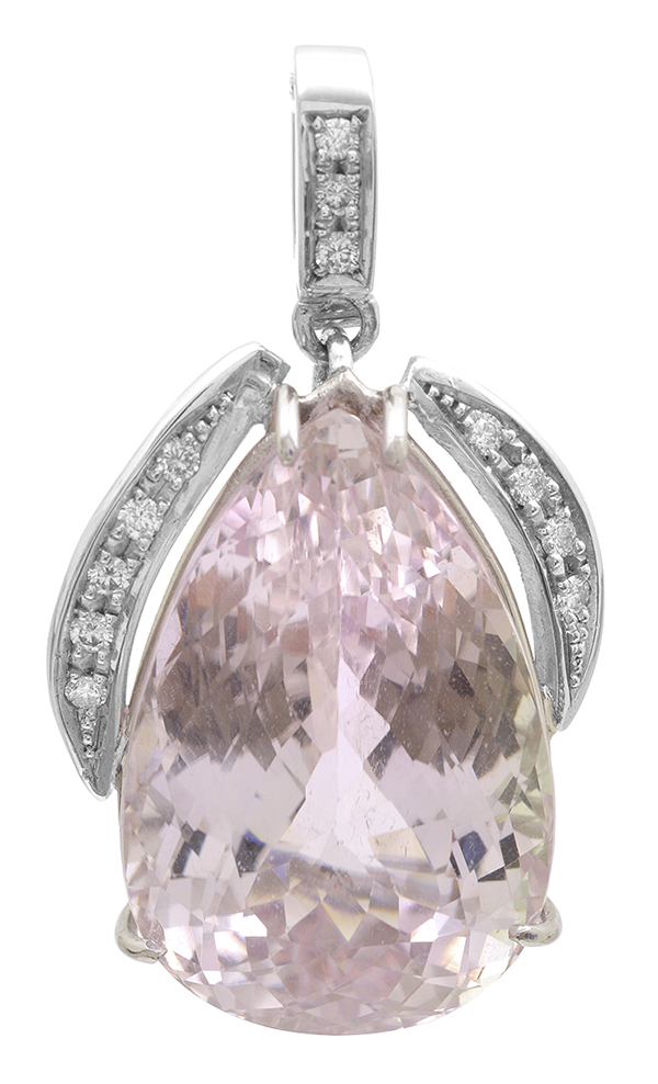 The pear cut kunzite of 52.20cts, having round brilliant cut diamonds set to the frame and bale mounted in 18ct white gold.