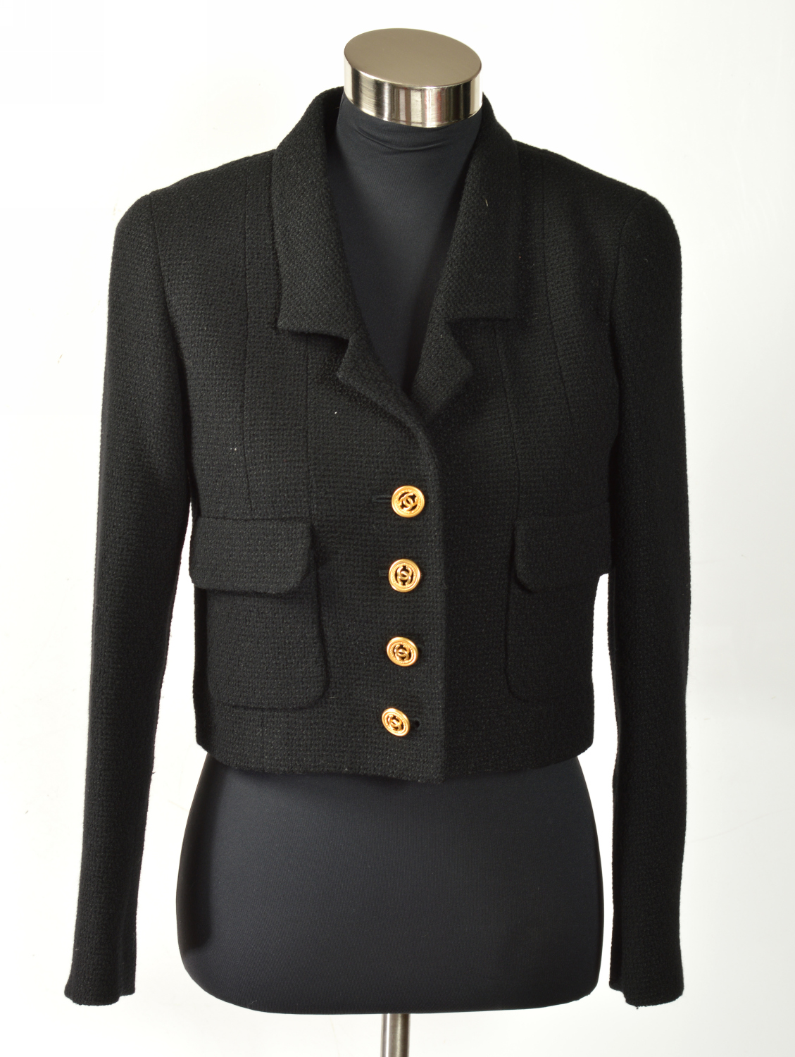 Styled in a black wool blend, with gold metal 'CC' buttons, and gold metal chain to the interior base, centre back length 43cm.