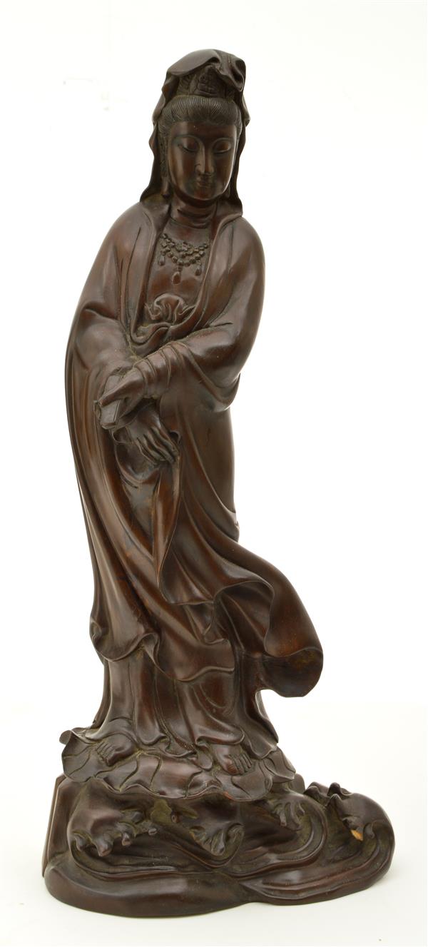 A FIGURE OF QUANYIN STANDING ON A LOTUS LEAF, RIDING STORMY WAVES
