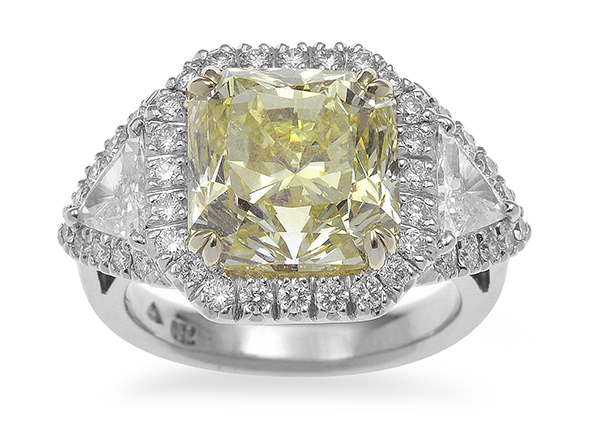 Centrally set with a fancy yellow radiant cut diamond weighing 7.05cts, flanked by white trilliant cut diamonds to the shoulders totalling 0.62cts, with further diamonds to the surround, totalling 0.63cts, mounted in 18ct white gold, ring size L, central stone accompanied by GIA certificate number 2101270675 stating natural fancy intense yellow, clarity VS2.