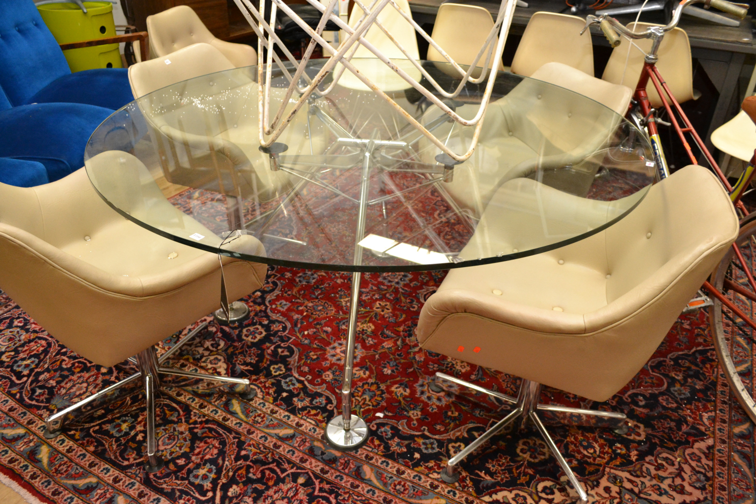 The table is in excellent condition aside from the chips to the glass, there are two the size of a 5 cent piece and two smaller. They can be repaired with a glass filler if need be.