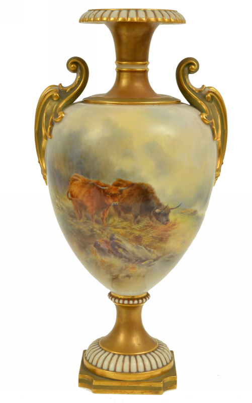 campana ,richly painted with a scene depicting highland cattle grazing in a mountainous landscape, a lesser landscape vignette to the reverse, flanked by foliate scroll handles, beneath a flared rim with a beaded edge, raised on a jewelled socle and a chamfered square foot, puce factory mark and model no. 1969, 41 cm high