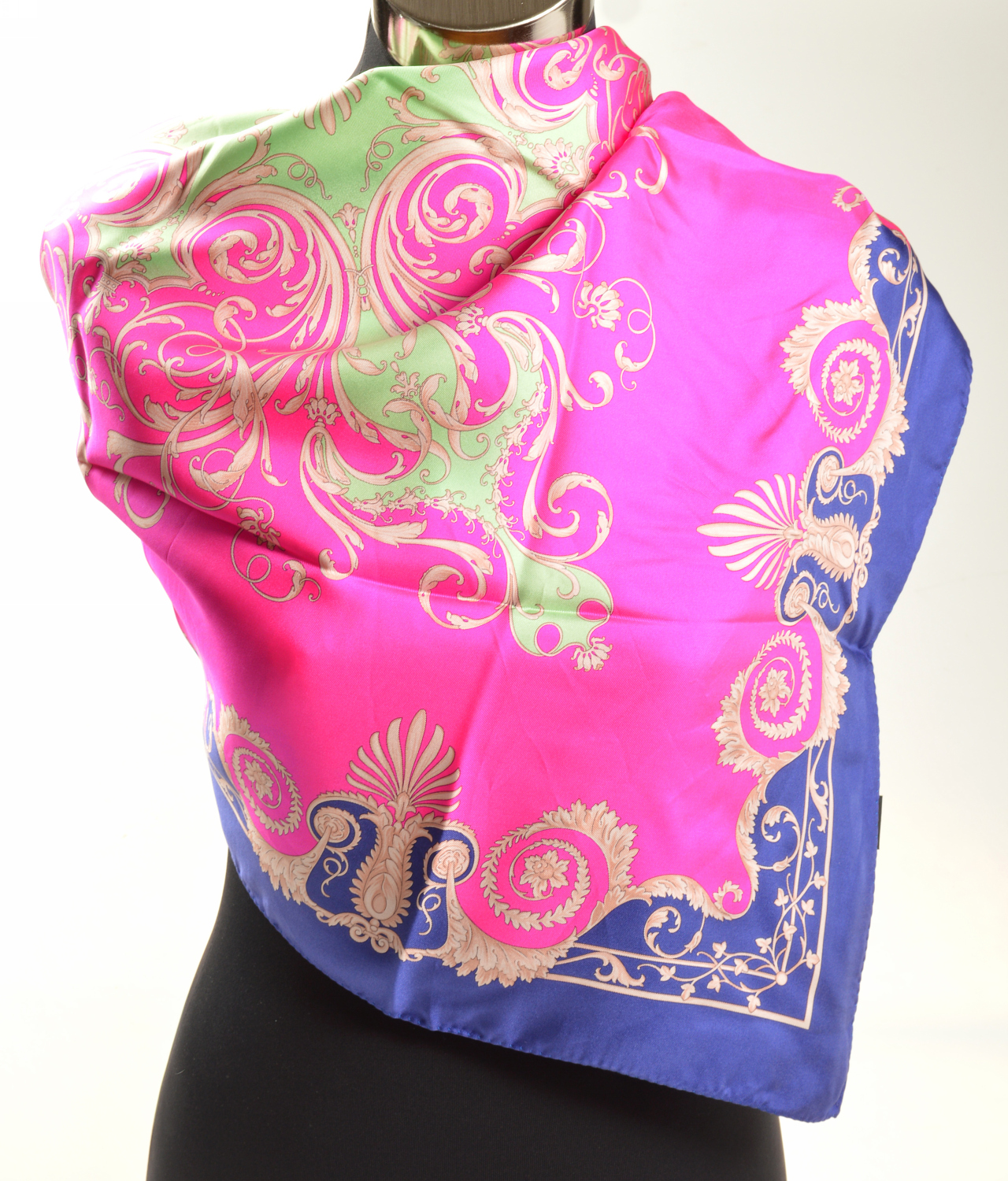Styled with a foliate and scroll design in vibrant pink, blue and green, 88cm square, with box.