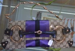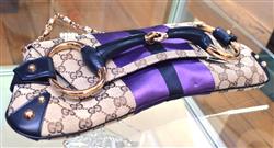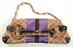 Styled in signature canvas, purple and black satin stripe, black leather trim and gold metal hardware, 37 x 15cm.