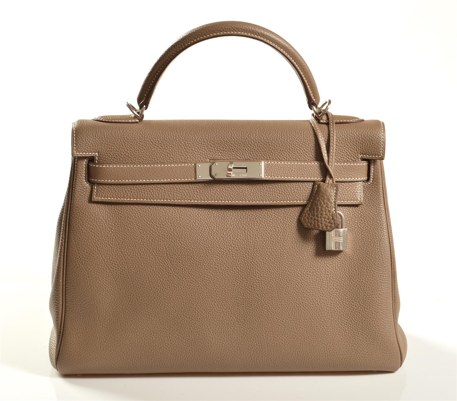 The 32cm taupe calfskin leather handbag, with detachable shoulder strap and palladium plated hardware, padlock and two keys, stamped J in a square.