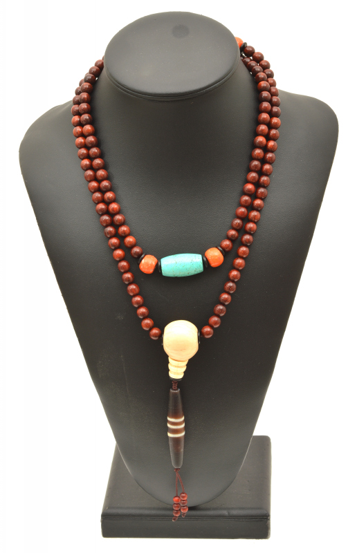 A CHINESE ROSEWOOD, CORAL & IVORY COURT NECKLACE, CHAO ZHU