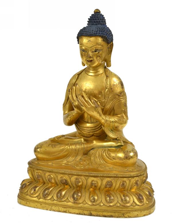 shown seated in dhyanasana on a double-lotus base, the hands are raised to the chest and perform the dharmacakra mudra, the gesture of turning the wheel of teaching, dressed in his traditional costume, a kasaya