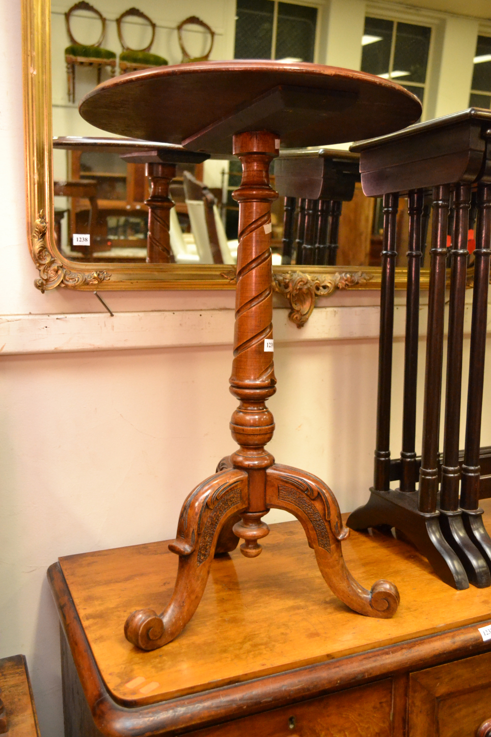 The circular top has an inset chessboard and a moulded edge, it rests on a twisted tapering column on a tripod base with cabriole legs on scroll feet