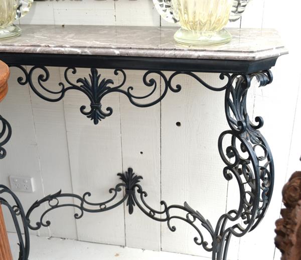 A French painted wrought iron based console, with a variegated marble top, 169cm x 105cm x 39.5cm