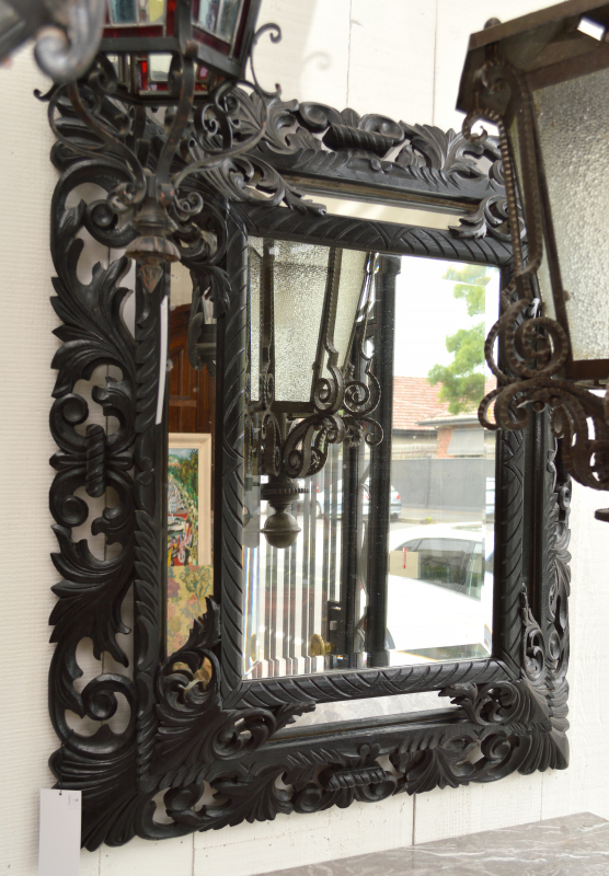 An rectangular ebonised framed cushion front wall mirror, with a foliate pierced frame, 105cm x 98cm
