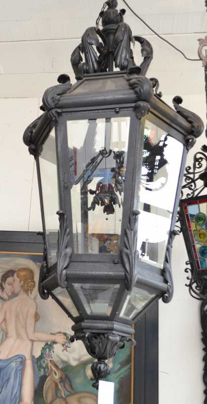 A large hexagonal wrought iron four light lantern, inset with bevelled glass panels, stamped Louis Tellier Aine Et Fils, 175 - 177 R. Gambetta Lille, approximately 151cm high