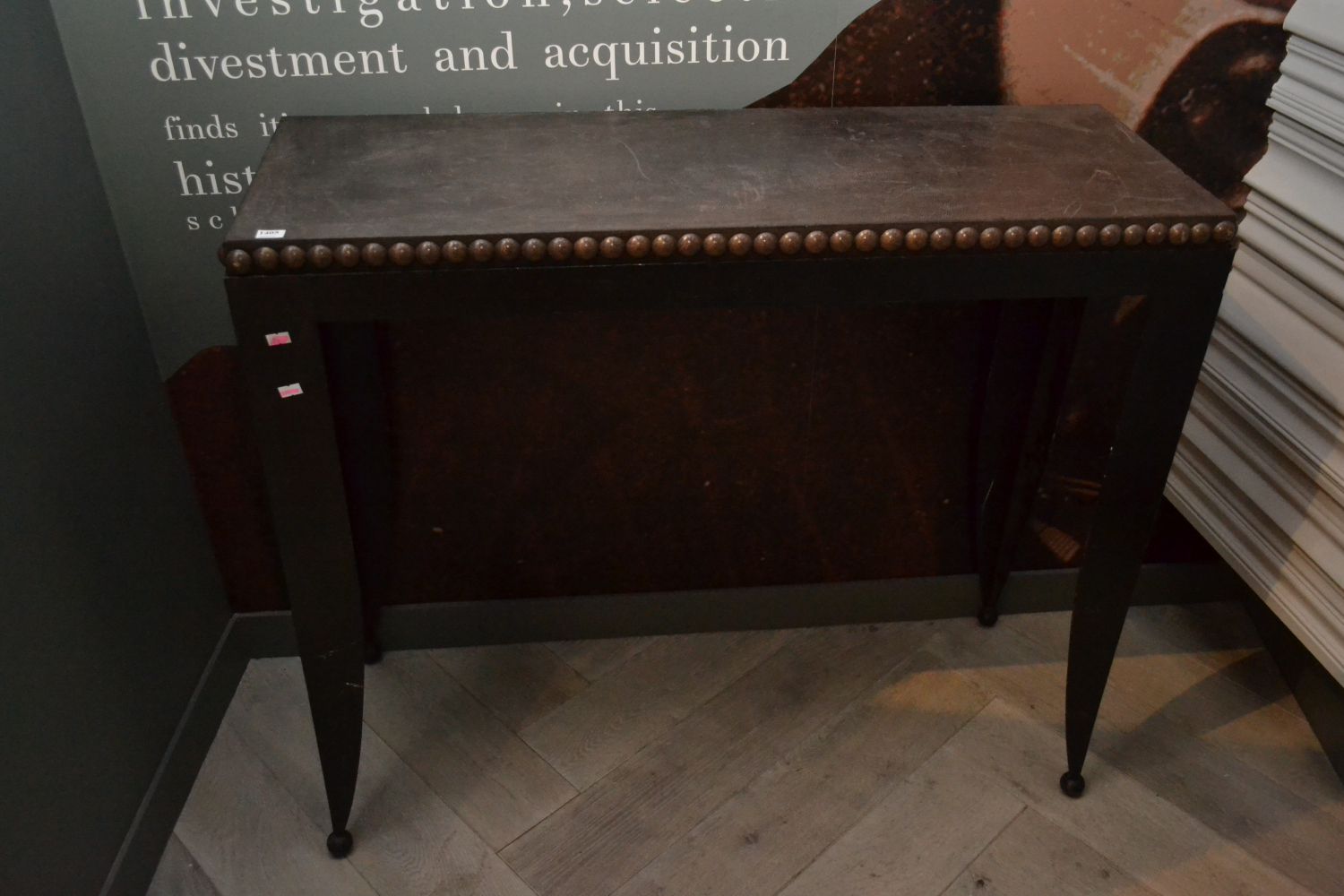 A French Art Deco iron framed console, with a studded leather mounted top, 101cm x 88.5cm x 36cm