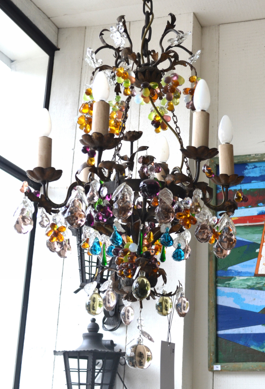 An Italian wrought iron and embossed metal framed six light chandelier, hung with coloured glass fruit, 77cm high