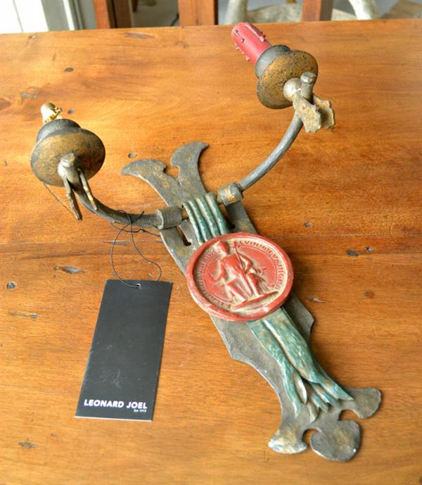 A pair of painted iron two light wall sconces, each centred by a roundel in the form of a wax seal, 36cm high