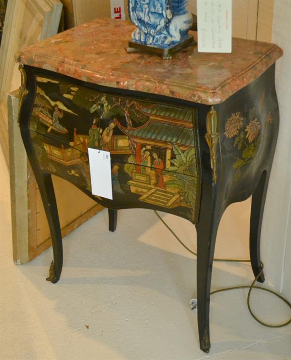 A Louis XV style Chinoiserie painted and carved two drawer commode, 60cm x 75.5cm x 36cm