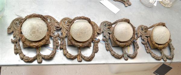 A set of four French Empire style foliate cast brass wall lights, with spherical frosted glass shades, 24cm high