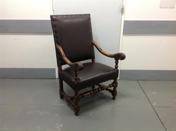 A French walnut framed armchair, with a chocolate leather upholstered back and seat