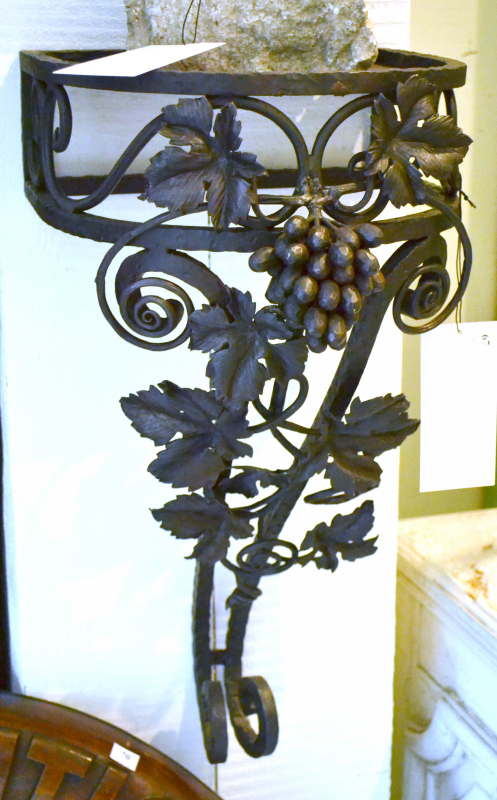 A French wrought iron wall bracket, applied with grape and leaf decoration, 63cm high