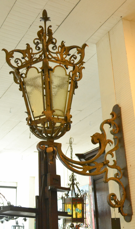 A large hexagonal wrought iron four light lantern, inset with bevelled glass panels, stamped Louis Tellier Aine Et Fils, 175 - 177 R...