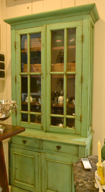 A French Provincial green painted bookcase, with two glazed upper doors above two frieze drawers and two panelled doors, 117cm x 242cm x 52.5cm