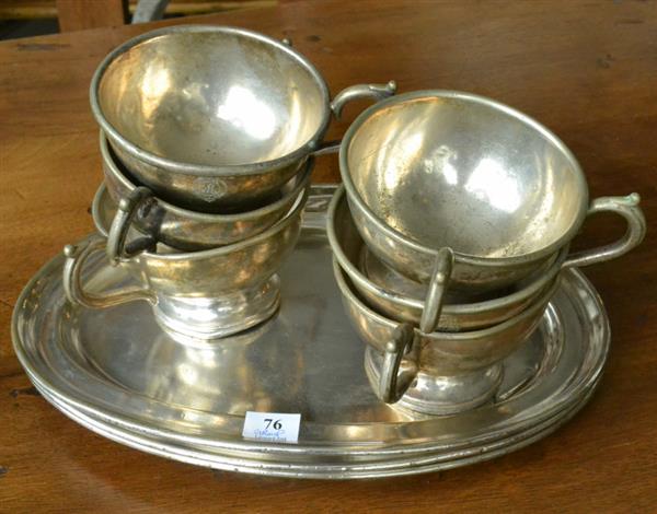 Three oval silver plate dishes, three single handled cups and three double handled cups