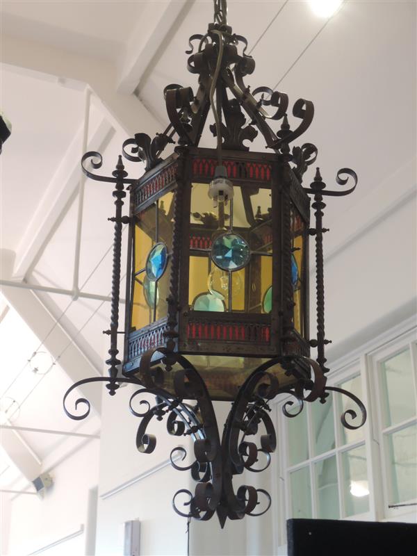 A wrought iron framed hexagonal hall light with leadlight panels, 90cm high