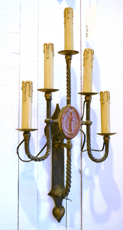 A pair of painted iron two light wall sconces, each centred by a roundel in the form of a wax seal, 36cm high