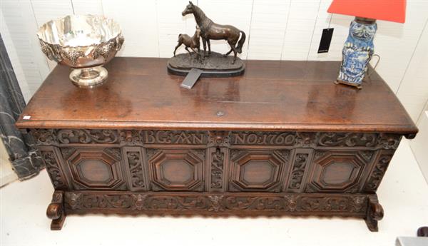 An 18th century carved panelled Italian oak cassone, 171cm x 58cm x 71cm