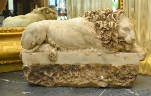 A pair of composite recumbant lion figurines, losses, 20cm x 29cm