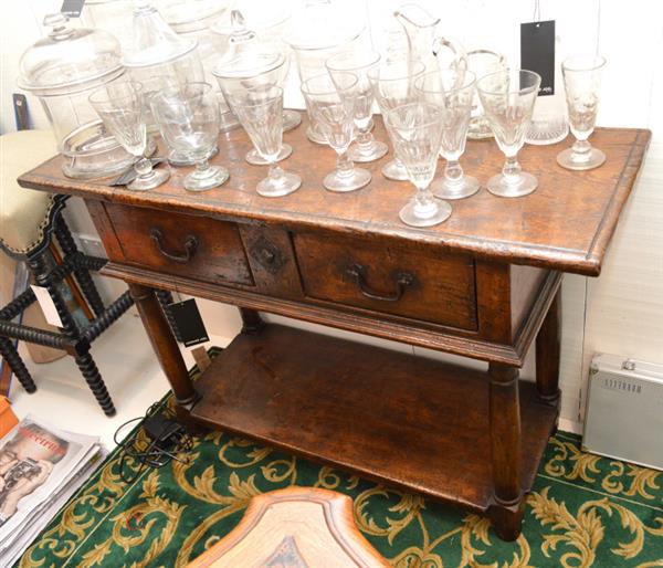 An 18th century Italian walnut two drawer side table, with turned supports and a lower shelf, 129 x 85 x 47cm