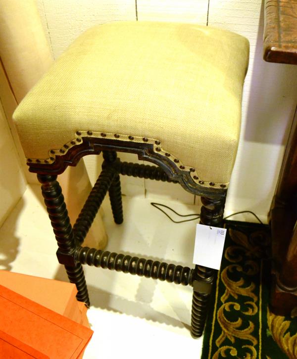 A set of four stools, each with a bobbin-turned ebonised frame and a seat upholstered in natural-tone cloth
