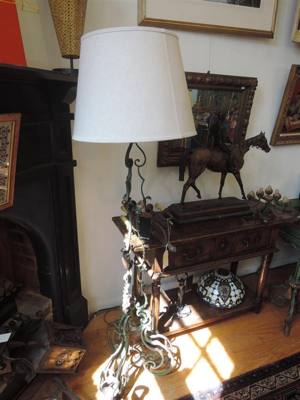 A large hexagonal wrought iron four light lantern, inset with bevelled glass panels, stamped Louis Tellier Aine Et Fils, 175 - 177 R...