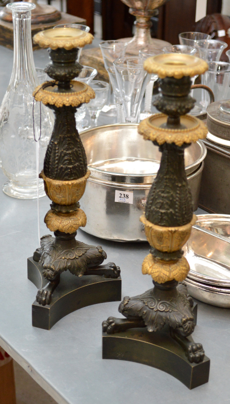 A pair of French Empire style bronze and gilt bronze candle sticks, 34cm high