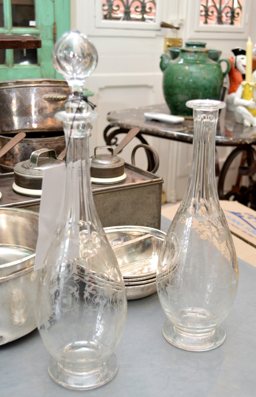 A pair of 19th century fluted and etched glass decanters, one missing a stopper, 30cm high excluding the stopper