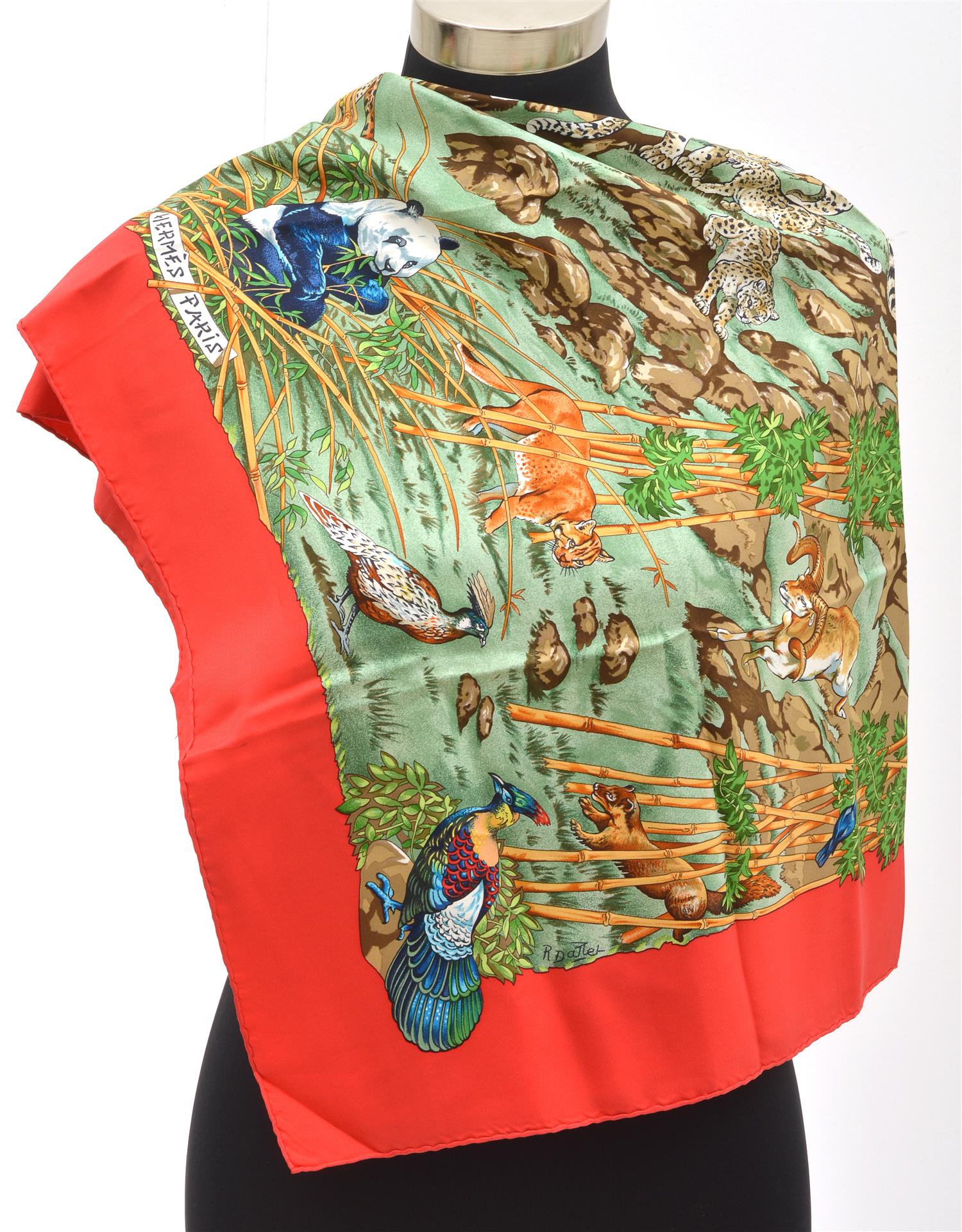 The 'Sichuan' design by Robert Dallet, in multi colours with a red border, 89cm square.