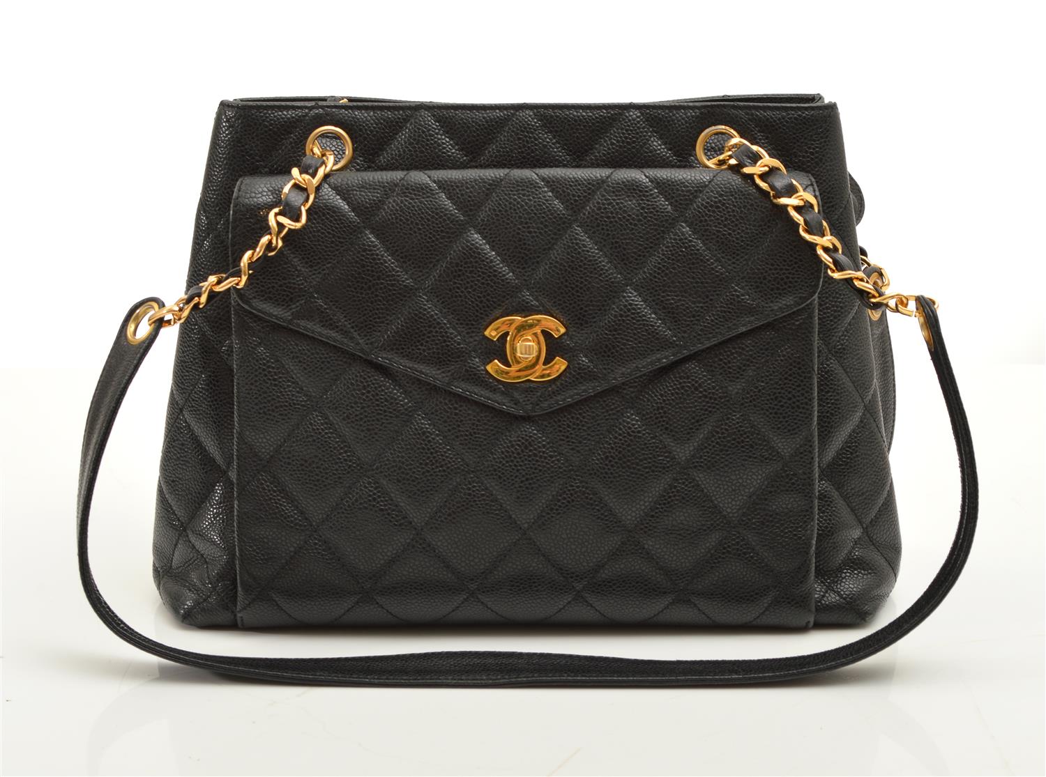 Styled in black quilted caviar leather, with black leather and gold metal chain straps, and gold metal hardware, authenticity card included, 40566266, 30 x 23 x 10cm.