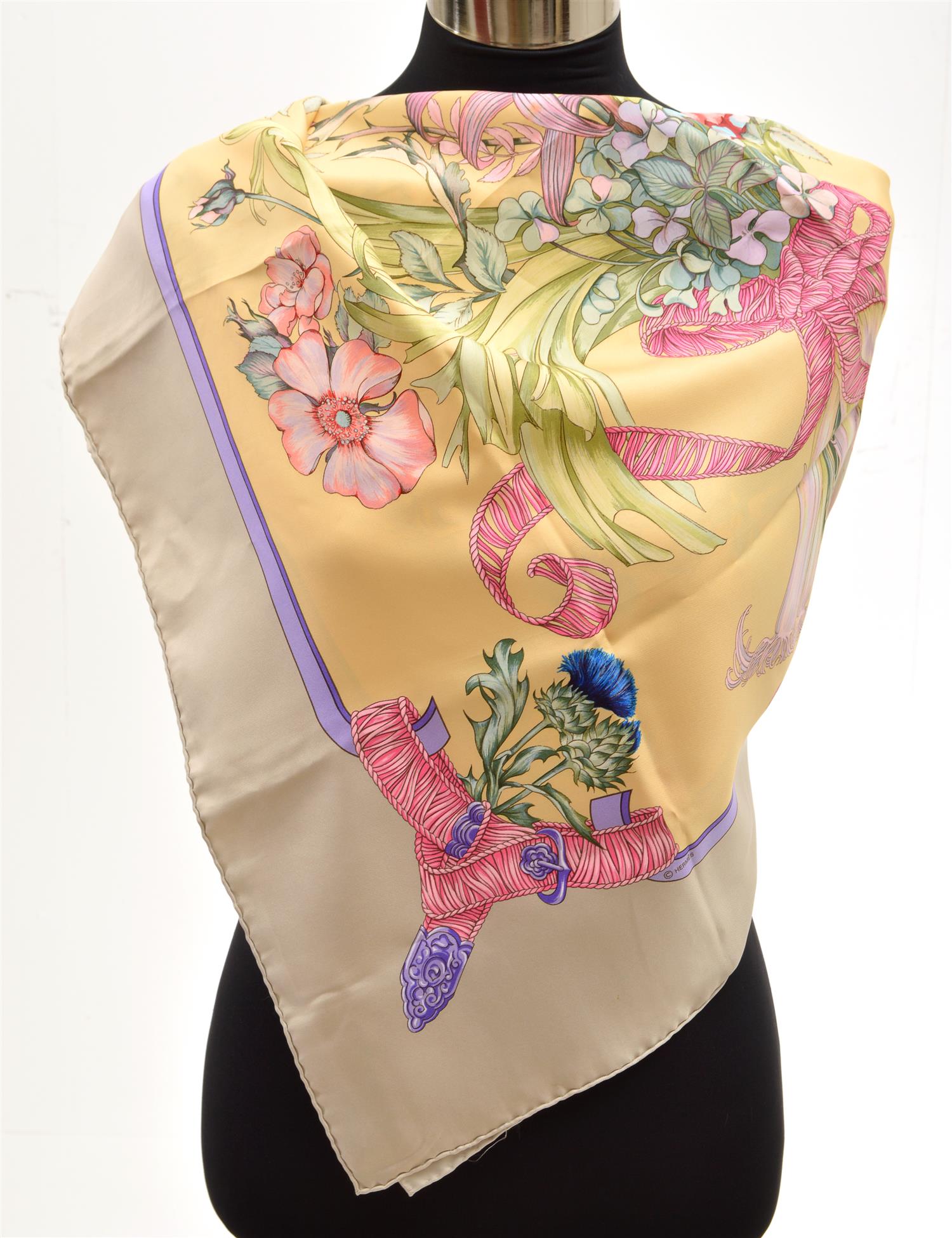 The 'Regina' design by Leila Menchari, depicting a multi colour bouquet, on a lemon and cream background, 89cm square.