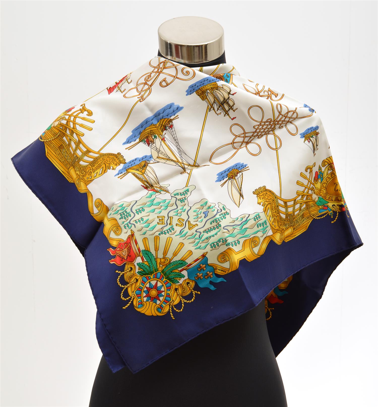 The 'Volies De Lumiere' design by Joachim Metz, in gold and blue on an ivory background, with a navy border, 89cm square.