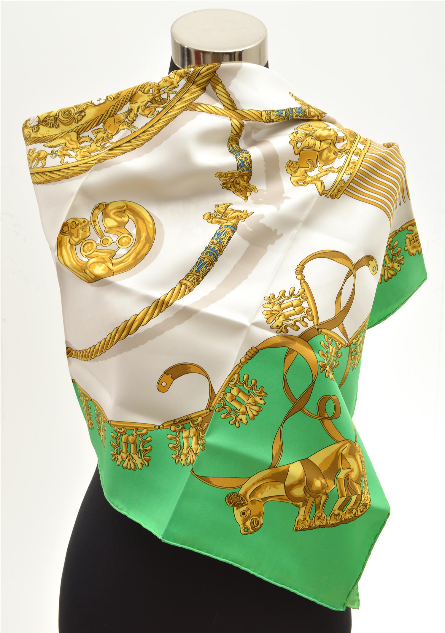 'Les Cavaliers d'Or' design by Vladimir Rybaltchenko, in gold and ivory on a green background, 89cm square.