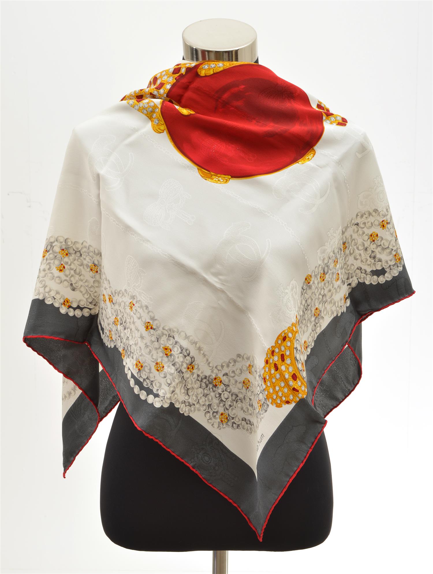 Styled with a signature panther and jewels design, on an ivory background with a grey border, 89cm square, with box.