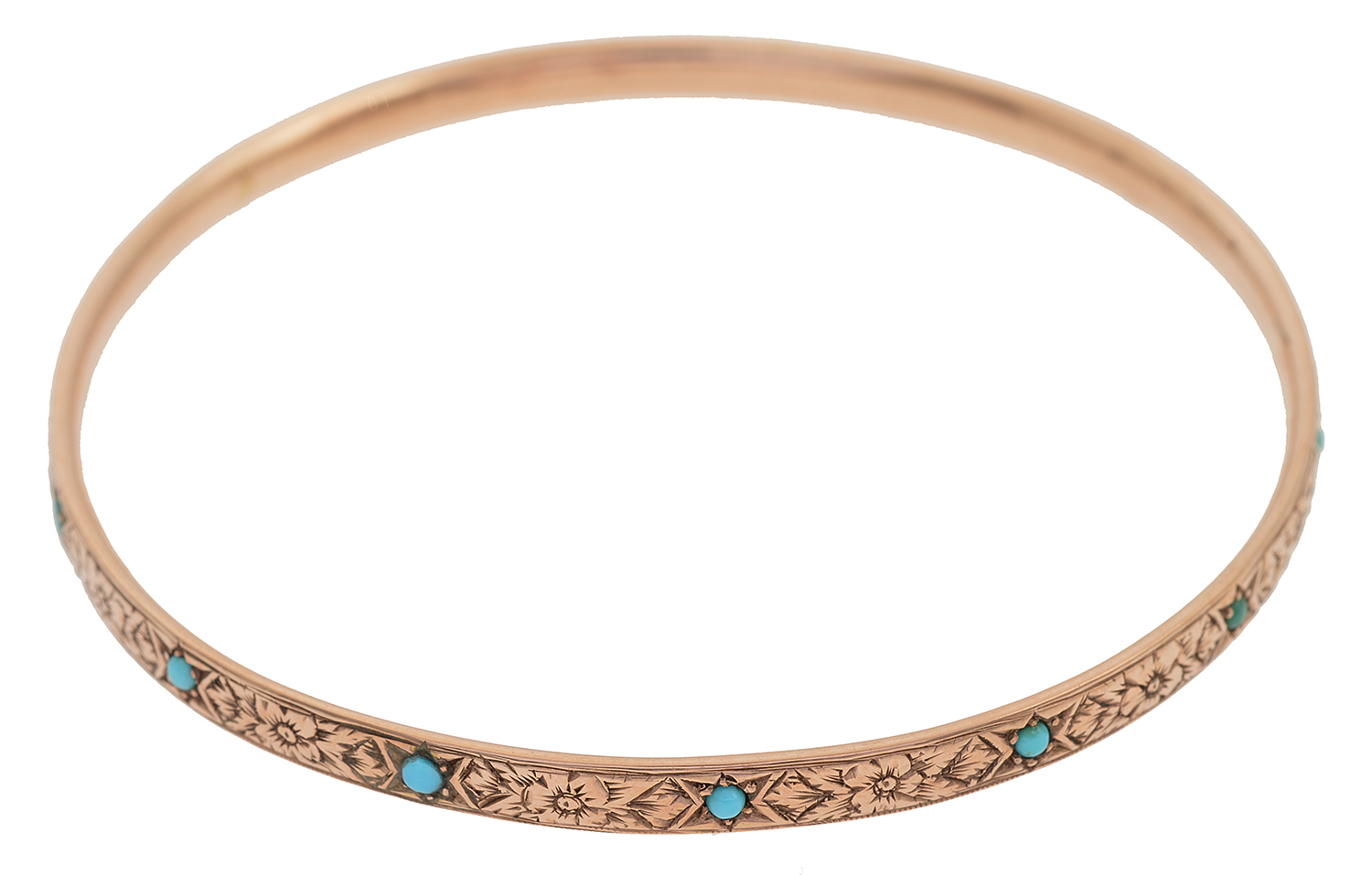 The circular bangle having engraved decoration and set throughout with turquoise, in rose gold.