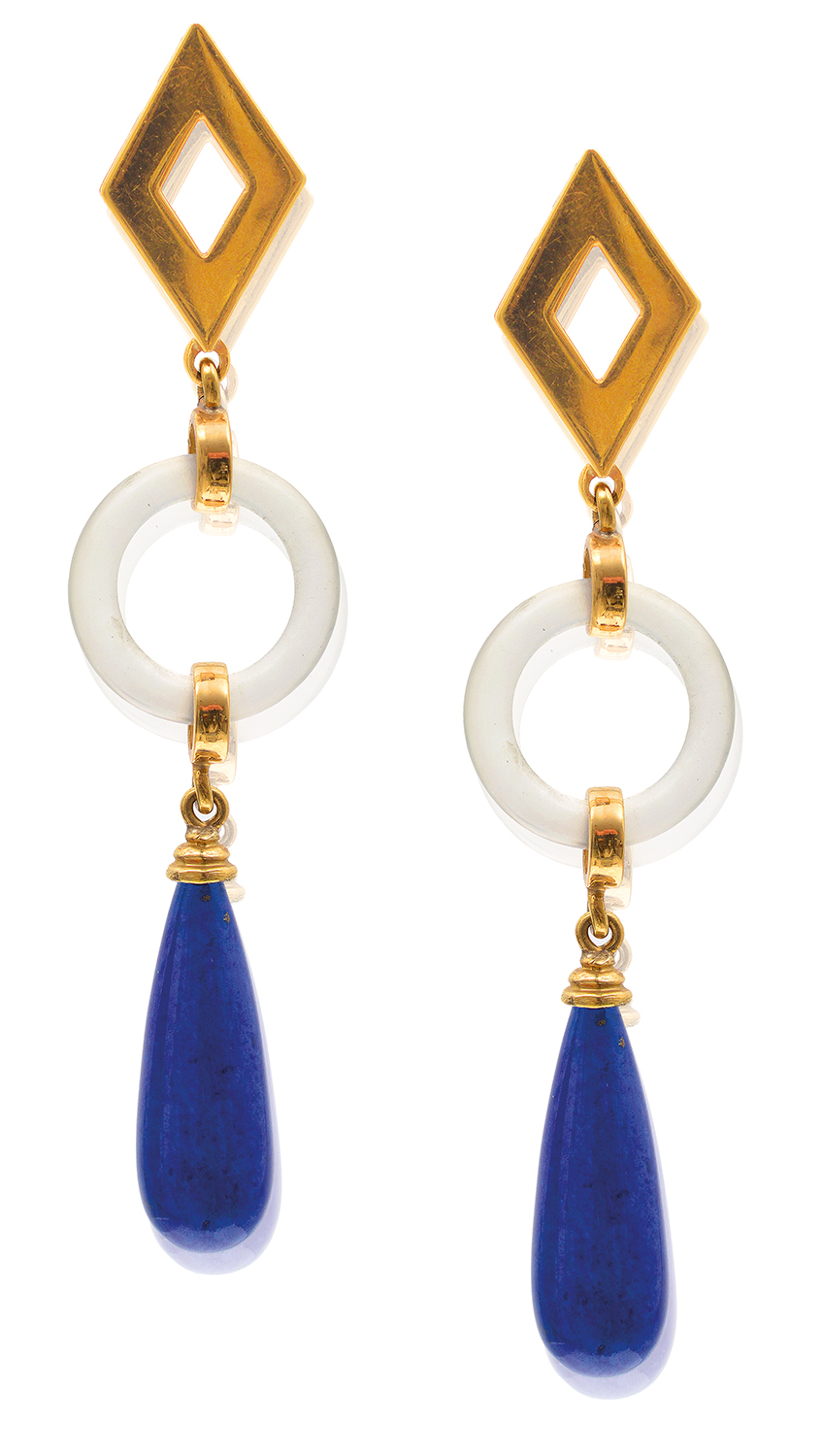 Each polished drop of lapis lazuli suspended from a circular disc of rock crystal and finished with pierced diamond shaped panels, all mounted in 18ct gold.