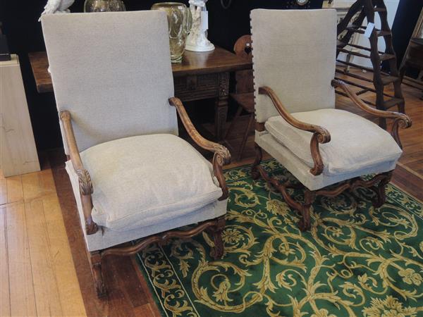 A pair of Louis Treize style armchairs, upholstered in natural tone fabric