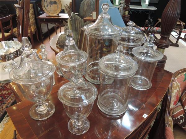 A collection of seven antique glass lidded urns, various sizes and shapes, the largest 46.5cm high