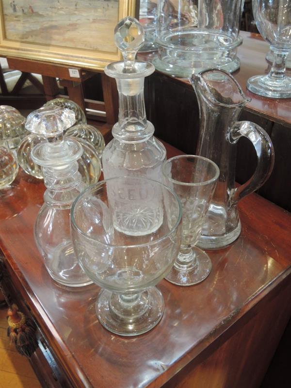 Five pieces of antique glass, including two goblets, a jug and two decanters