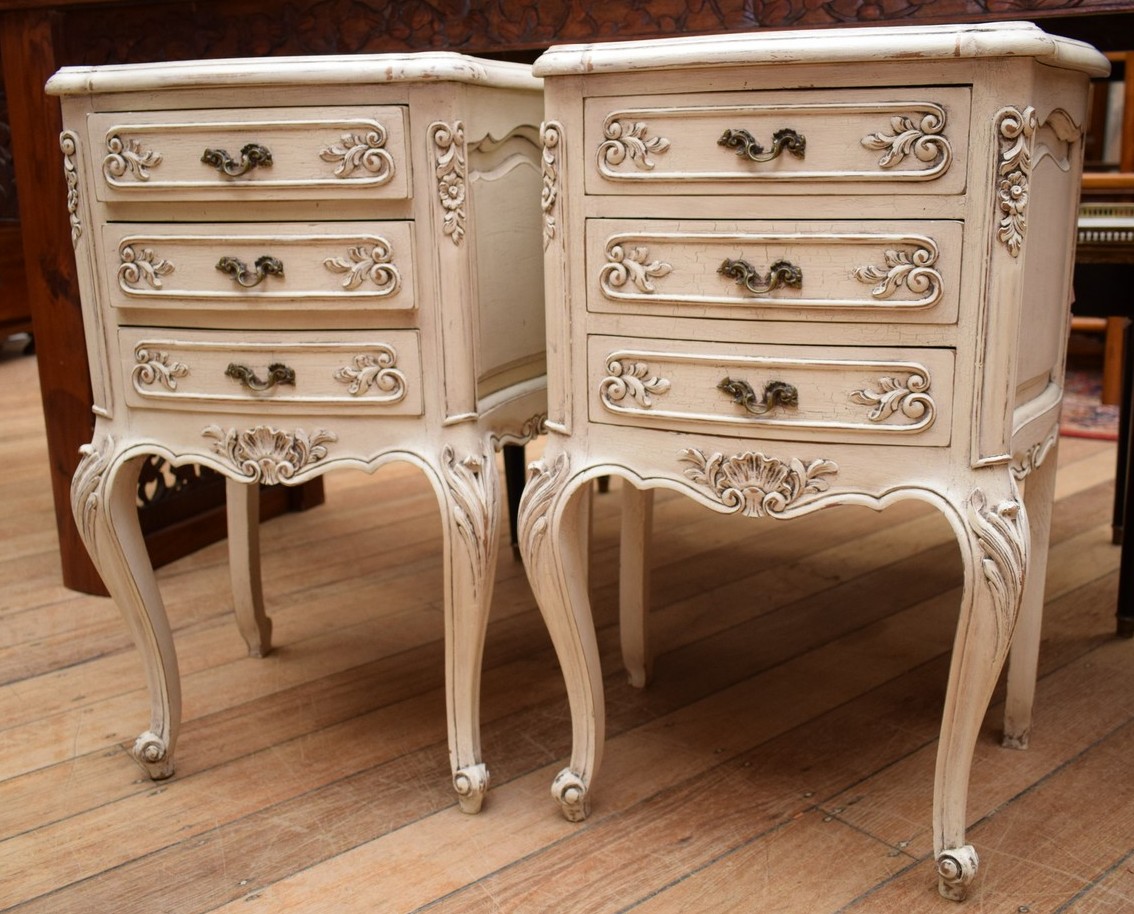 A pair of white painted French provincial style two drawer bedside cabinets, 45 x 64.5 x 32.5cm