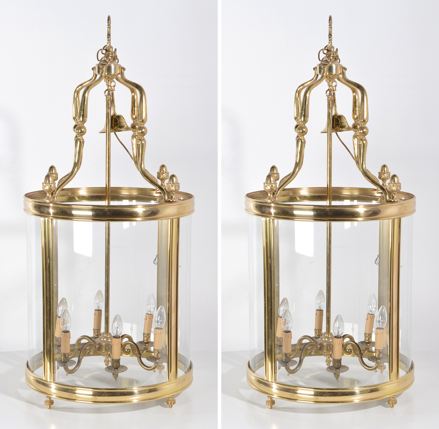 A PAIR OF BRASS FRAMED CYLINDRICAL LIGHT FITTINGS