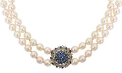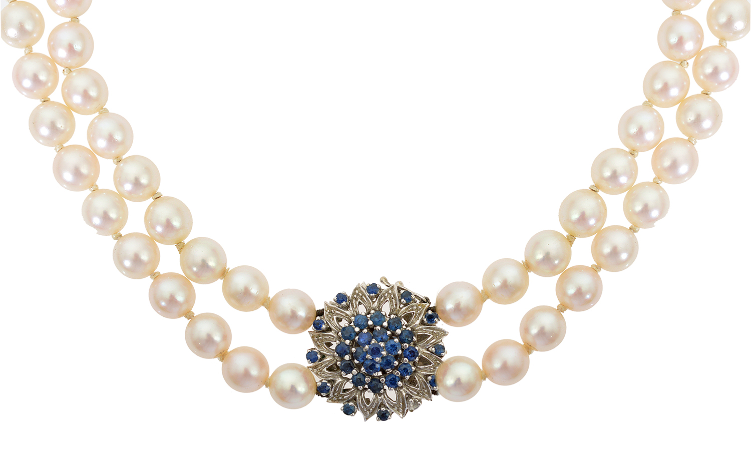 The round Akoya pearls of pink and cream hue measuring 7.40mm - 7.80mm, to a pierced floral clasp set with blue sapphires in 18ct white gold, total length 460mm.